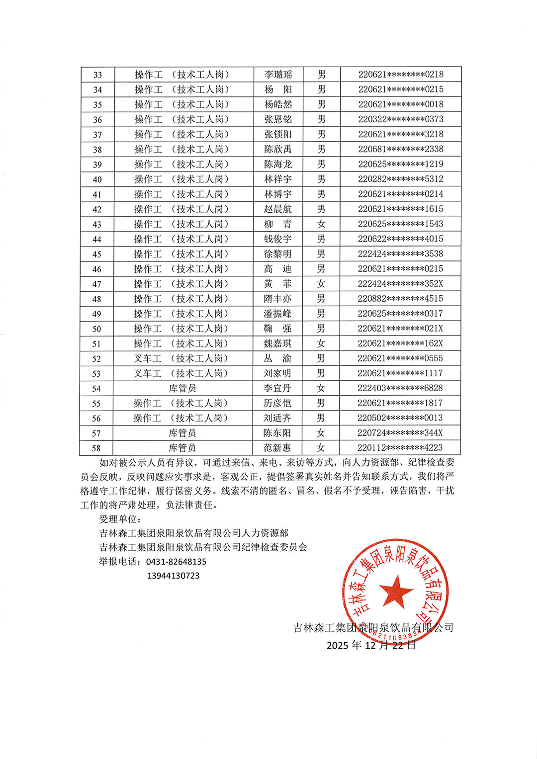 吉林森工集團(tuán)泉陽(yáng)泉飲品有限公司2025年度下半年社會(huì)化公開招聘擬錄用人員公示